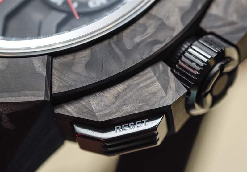 這款布加迪限量版采用了許多精美的細節,例如除了表殼材料外還使用了黑色陶瓷按鈕(和表冠),這對于 Epic X 系列來說是新的。Epic X 的關鍵功能細節之一(很容易錯過)是內部旋轉計時表圈。也就是說,很明顯這不是一個完全合作的手表設計,因為它并沒有真正包含太多的布加迪 DNA。它不是布加迪手表,因為宇舶的法拉利手表是與法拉利合作設計生產的,但如果 Jacob & Co. 和布加迪可以在設計上合作,我會看到未來會有更多視覺上新穎的產品,這可能會更獨特、更令人滿意地以合作伙伴獨有的方式將鐘表和超級跑車的世界融合在一起。