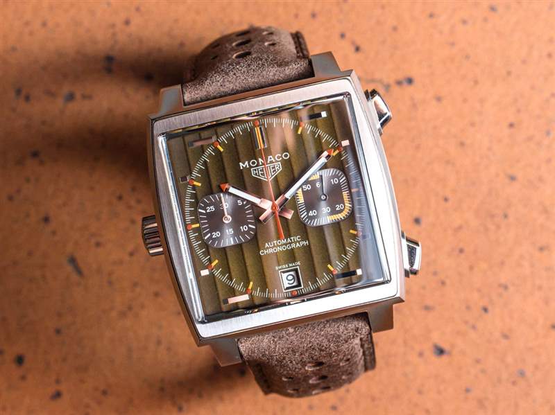 時標的方向、指針和小表盤的設計,以及這款限量版 Monaco 1969-1979 手表的整體外觀與“原始風格”相同,但采用了新的調色板,肯定會偏光和有意利基市場。豪雅稱表盤顏色為“帶有日內瓦波紋的綠色”。它是一種金屬橄欖綠色,帶有垂直拋光條紋,類似于您在許多瑞士制造的手表機芯表面上發現的條紋。大地色系讓人想起 1970 年代風格設計中流行的調色板,并以各種形式卷土重來。我真的很喜歡泰格豪雅如何理解這種特殊的摩納哥配色在設計上是小眾的,并將其作為泰格豪雅限量版編號方案中的一組獨家產品。