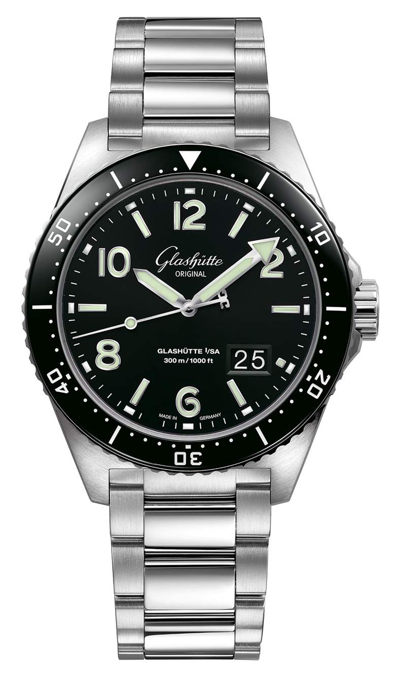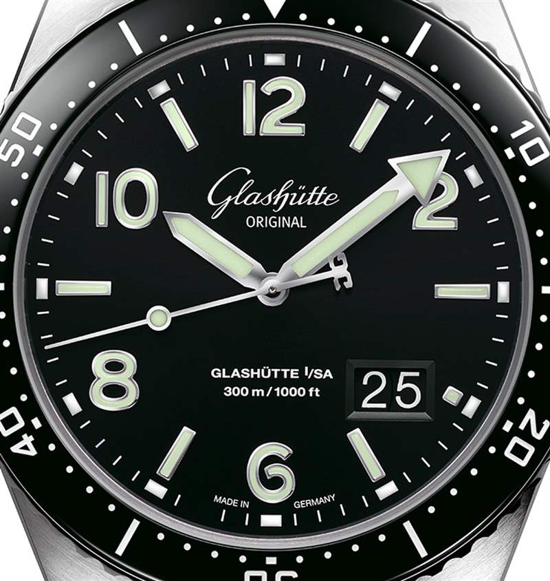 Spezialist SeaQ Panorama Date 表殼采用鋼制,采用品牌新造型,寬 43.2 毫米,厚 15.65 毫米。防水深度達 300 米,這是一款真正的潛水表,最后我們有一個來自 Glashutte Original 的旋轉表圈,帶有陶瓷鑲嵌物。防刮黑色陶瓷表圈設計帥氣而永恒,但在手表設計史上的這一點上并不是特別獨創。格拉蘇蒂原創贏得高端腕表尊重的地方在于表盤的執行力和易讀性。僅僅重現復古手表的外觀是不夠的,為了收取這么多錢,你需要讓它比原來的手表好得多。