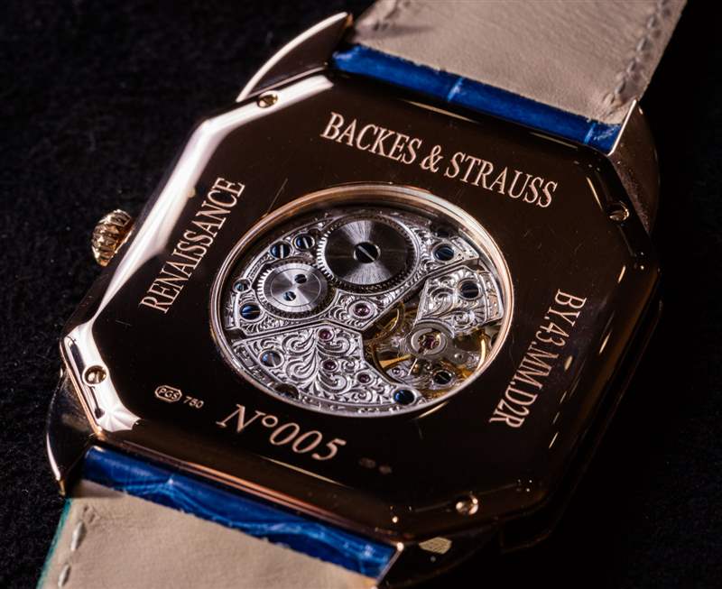 表盤還有一些其他的裝飾元素,并被處理為藍色,并搭配一條非常吸引人的藍色鱷魚皮表帶。手表內(nèi)部是一個手動上鏈的瑞士 ETA 機芯,可通過后藍寶石水晶窗看到。機芯非常簡單,您可以在非常基本的時計中找到它。該機芯被稱為 ETA Peseux 7001,但通過在機芯橋板表面上以蔓藤花紋雕刻形式進行的手工裝飾處理使其更加有趣。我相信 Backes & Strauss 喜歡這款機芯,因為它可靠、簡單且非常薄,非常適合僅計時、外殼更薄的手表。