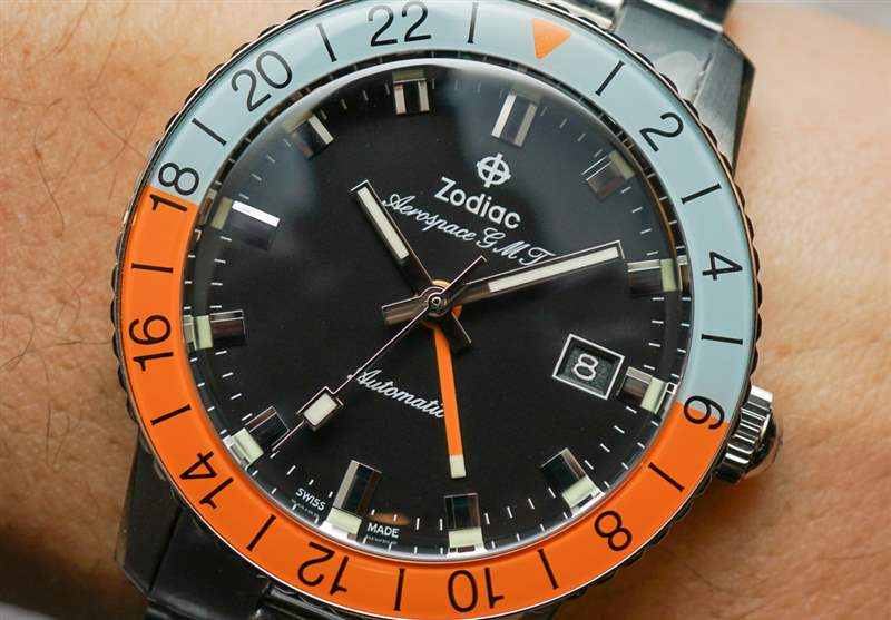 Aerospace GMT 手表使用與 Zodiac 的 Sea Wolf 相同的 40 毫米寬表殼輪廓用于航空航天 GMT——這不是一件壞事。它也有一個類似的旋轉表圈,盡管它上面有一個 GMT 表圈,并且可以在兩個方向上旋轉。表鏈和表盤當然是與眾不同的,機芯也是如此。后一種元素在 Zodiac 粉絲中引起了一些爭議,因為 Aerospace GMT 不包括內部制造的機芯。Zodiac 歸 Fossil 集團所有,后者還擁有機械機芯制造商瑞士 STP。