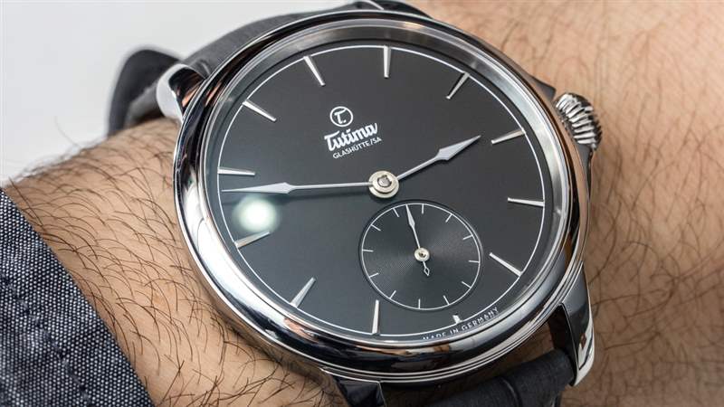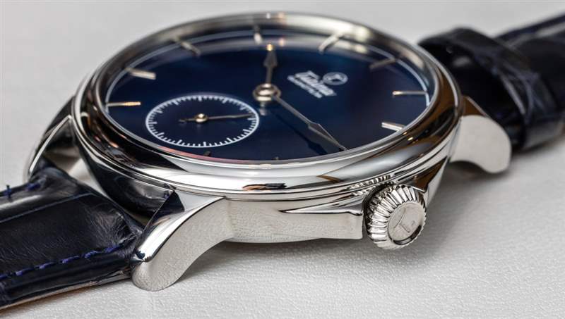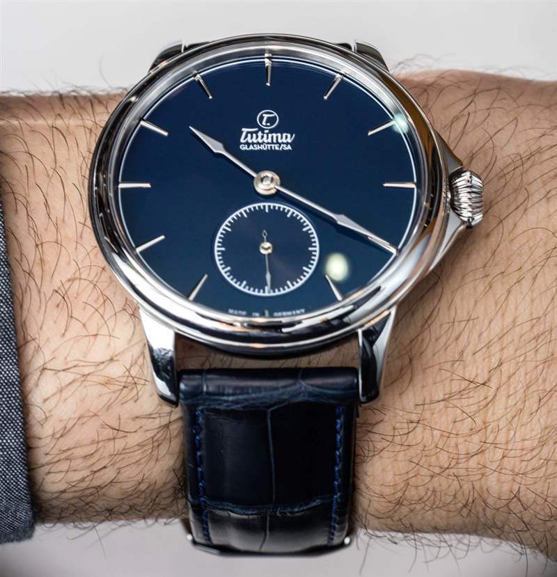 如今,正裝手表比運(yùn)動(dòng)手表更難銷(xiāo)售,主要是因?yàn)檫\(yùn)動(dòng)手表往往對(duì)許多奢侈手表購(gòu)買(mǎi)者具有更多的日常吸引力。正裝手表更漂亮,但通常提供的佩戴機(jī)會(huì)較少,除非您經(jīng)常穿著西裝或正裝。考慮到它的尺寸和它所提供的個(gè)性,像這樣的 43 毫米正裝手表可以兼作外觀(guān)優(yōu)雅的“牛仔褲和 T 恤手表”。我覺(jué)得今天大多數(shù)比較成功的正裝手表都屬于這一類(lèi),因?yàn)樗鼈儗?duì)業(yè)主來(lái)說(shuō)更加時(shí)尚百搭。價(jià)格也很重要;大多數(shù)人不認(rèn)為 20,000 美元以上的金表適合休閑裝。將這個(gè)價(jià)格四分之一并提供鋼制表殼,現(xiàn)在你有了更多“日常吸引力”的東西。” 這就是為什么我認(rèn)為 Tutima 應(yīng)該能夠憑借 Patria Steel 如此成功,尤其是這款可愛(ài)的 Patria Admiral Blue 表款,搭配藍(lán)色鱷魚(yú)皮表帶和琺瑯表盤(pán)。