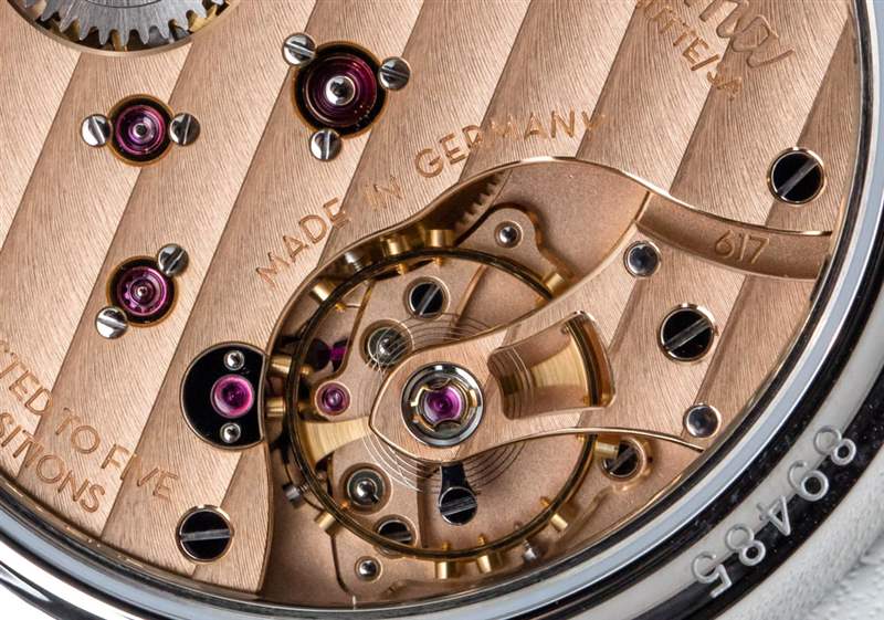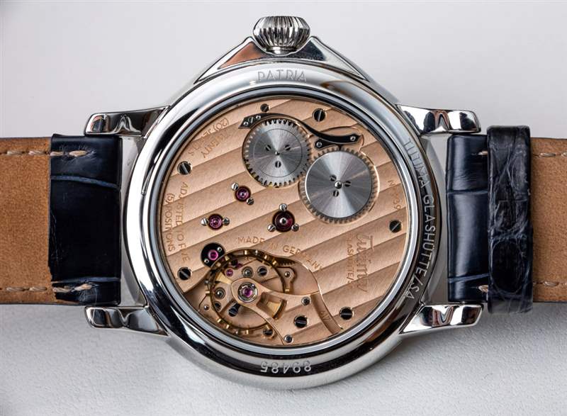 Tutima Patria 藍(lán)色海軍上將參考。6610-01(也有灰色或白色表盤(pán)版本的 Patria 鋼)基于 Patria 小秒針系列,該系列使用該品牌最簡(jiǎn)單的手動(dòng)上鏈計(jì)時(shí)機(jī)芯。Tutima 生產(chǎn)這種具有其他功能的更高級(jí)版本的機(jī)芯,例如動(dòng)力儲(chǔ)存指示器和第二時(shí)區(qū)。也就是說(shuō),您可以使用 Patria 鋼獲得真正的高級(jí)鐘表,而海軍上將藍(lán)色表盤(pán)實(shí)際上是烤琺瑯。Calibre 617 機(jī)芯非常好看,采用典型的德國(guó)風(fēng)格制造,帶有 3/4 夾板和用于固定紅寶石的金色套筒。該機(jī)芯還具有良好的手工加工水平,并且尺寸合適,因此通過(guò)手表上的藍(lán)寶石水晶底蓋可以看到表殼。機(jī)芯以 3Hz (21, 600 bph),動(dòng)力儲(chǔ)存為 65 小時(shí)。手動(dòng)上鏈機(jī)芯帶有輔助(小)秒盤(pán)顯示時(shí)間。廣告訊息廣告信息結(jié)束