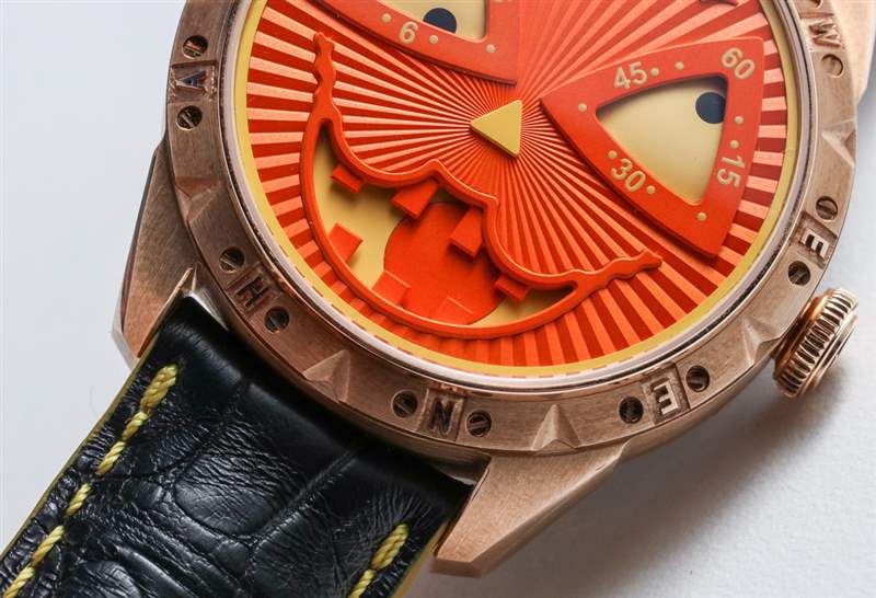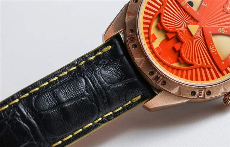 與手表搭配的是定制的黑色鱷魚皮表帶,橙色內(nèi)襯和黃色滾邊以及與表殼相配的青銅色縫線。當然,這是一款有趣的手表,但并不適合所有人。實際上,它只需要吸引它的所有者。我不得不承認,雖然我可能不會每天都嫉妒,但在萬圣節(jié)那天,我想不出還有哪只手表是我寧愿戴在手腕上的。