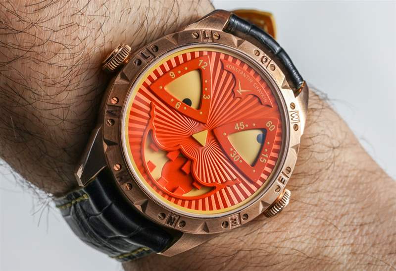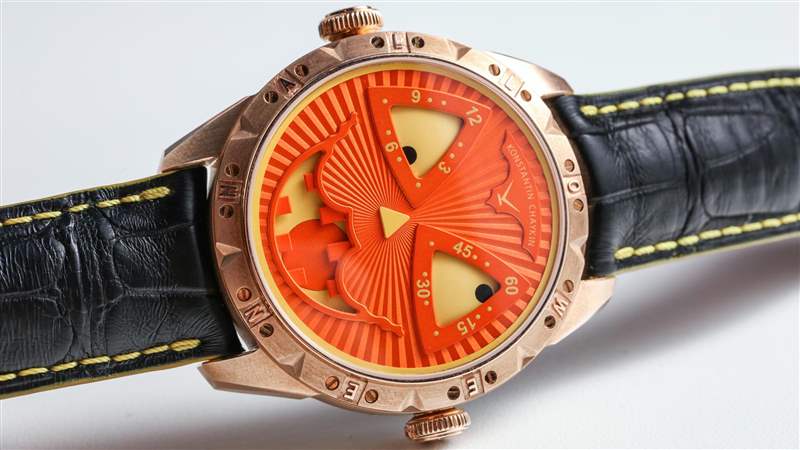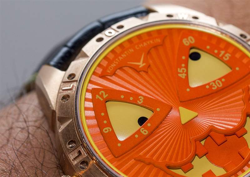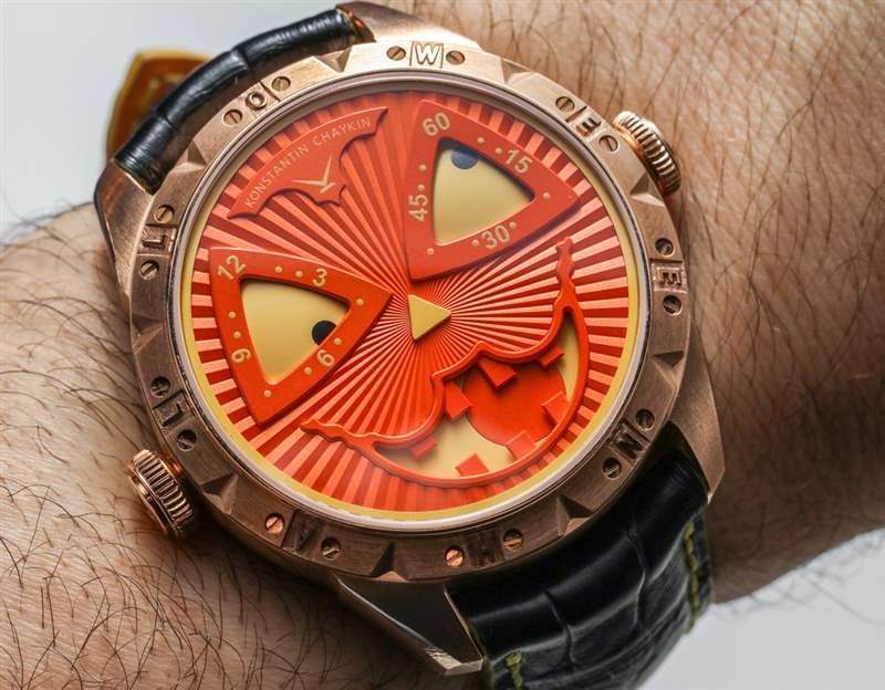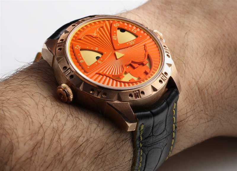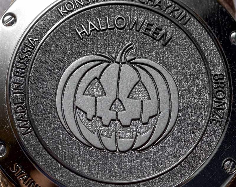 對于這個版本的小丑,Konstantin Chaykin 決定用青銅制作萬圣節(jié)——這應(yīng)該會很有趣。表殼寬 42 毫米,厚 13.7 毫米。表盤上方是 AR 涂層藍寶石水晶。“萬圣節(jié)”也拼寫在整個表圈周圍。