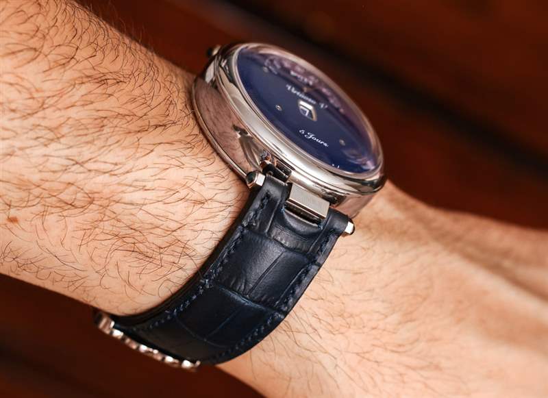當佩戴在手腕上時,Virtuoso V 的尺寸和重量都不是問題——盡管這不是一款特別小或特別輕的手表(里面有很多黃金?。K{色鱷魚皮表帶與表盤上的彩色“flinqué 琺瑯風格”雕刻和上漆工作相得益彰——其中一個表盤幾乎完全雕刻和上漆在這款稀有版本的腕表上。這個版本的 Virtuoso V 在審查時甚至沒有出現在播威網站上——其他版本(不同的表殼材料和可選的鉆石)在表盤的跳時指示器側具有不同的外觀。