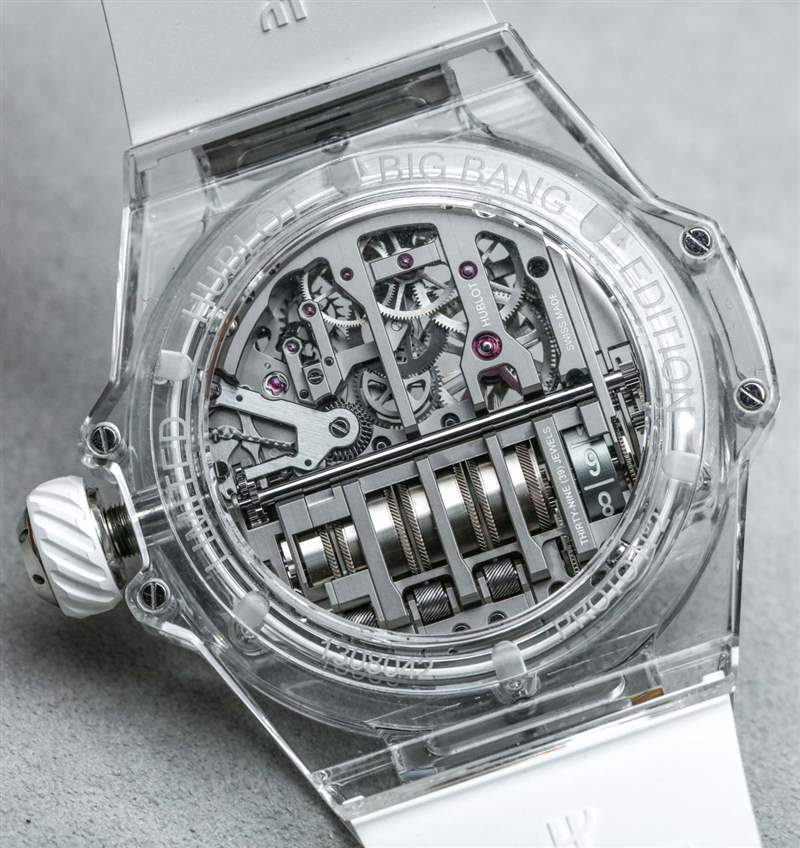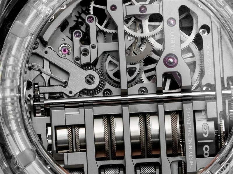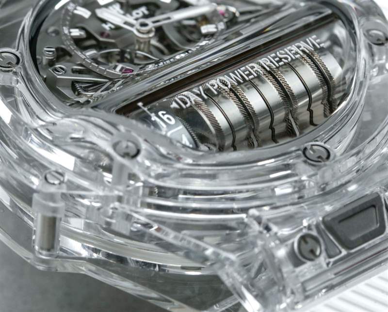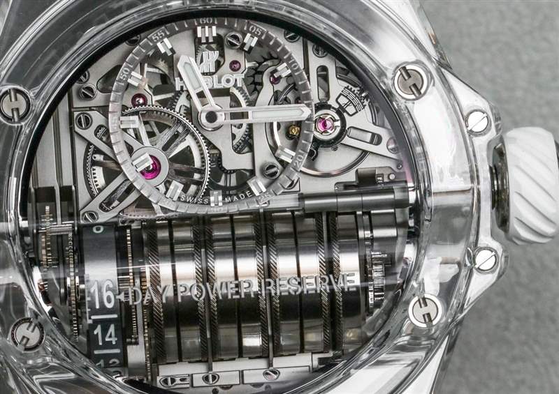 宇舶 MP-11 內(nèi)部開發(fā)和生產(chǎn)的機(jī)芯是具有兩周動(dòng)力儲(chǔ)存的 HUB9011 手動(dòng)上鏈機(jī)芯。大約 336 小時(shí)的動(dòng)力儲(chǔ)存來自總共七個(gè)耦合的主發(fā)條盒,您可以數(shù)數(shù),因?yàn)樗鼈兯蕉询B并通過表盤可見。主發(fā)條盒的左側(cè)是一個(gè)額外的鼓,用作動(dòng)力儲(chǔ)存指示器。我真的很佩服如果您閱讀動(dòng)力儲(chǔ)存刻度上的當(dāng)前數(shù)字(剩余天數(shù))以及旁邊的文字,它會(huì)創(chuàng)建一個(gè)可以在您的腦海中閱讀的聲明(例如,“12 天動(dòng)力儲(chǔ)存”)。主發(fā)條盒上方是一個(gè)偏心但清晰易讀的小時(shí)和分鐘顯示。