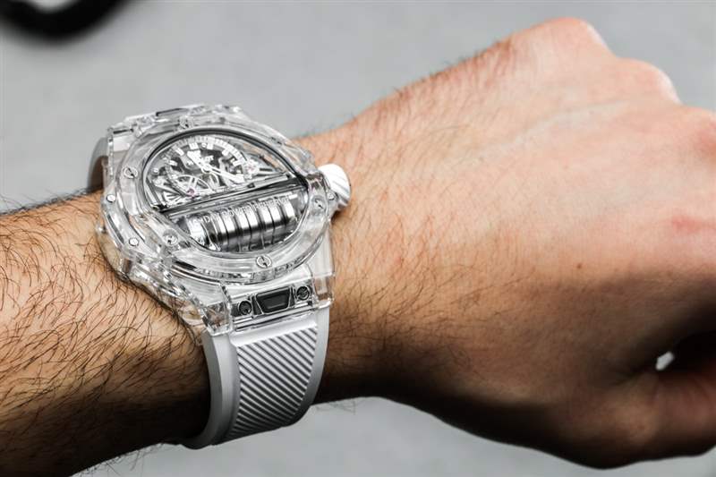 MP-11 是一款可靠的產(chǎn)品,因?yàn)樗蚨嗷蛏俚厥褂昧藰?biāo)志性的宇舶 Big Bang 風(fēng)格表殼和具有 14 天動(dòng)力儲(chǔ)存的機(jī)芯。這使得該模型在美學(xué)吸引力方面不那么“小眾”,在我看來,這與宇舶作為機(jī)芯設(shè)計(jì)師的優(yōu)勢(shì)以及熟悉的 Big Bang 表殼美學(xué)的獨(dú)特外觀很好地聯(lián)系在一起。2018 年 MP-11 Power Reserve 14 天作為參考號(hào) 911.QD.0123.RX 碳纖維和參考號(hào) 911.JX.0102.RW 藍(lán)寶石水晶。表殼寬 45 毫米,防水深度達(dá) 30 米,并且比標(biāo)準(zhǔn)的 Big Bang 表殼稍厚,考慮到容納從手表正面可見的一排主發(fā)條盒所必需的“凸塊”。