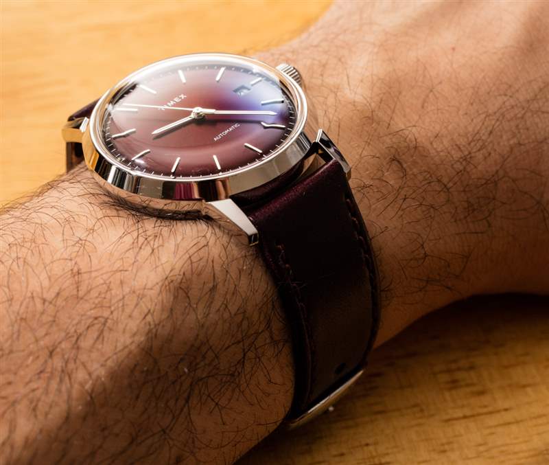 附在表殼上的是一條 20 毫米寬的皮革表帶,根據(jù)表盤和表殼顏色有四種色調(diào)之一。表帶做工很好,戴在手腕上感覺既柔軟又柔軟。與價(jià)格相近的日本正裝手表的表帶相比,天美時(shí)在皮革部門擊敗了它們。如上所述,Marlin Automatic 以四種款式首次亮相,包括天然和金色鋼表殼,以及銀色、黑色、深灰色和栗紅色表盤。手套顏色也不同,旨在與手表的其余部分搭配使用。Timex 位于米蘭的設(shè)計(jì)團(tuán)隊(duì)在確保顏色和飾面恰到好處方面做得非常出色——這種價(jià)位的手表通常無法接受這項(xiàng)服務(wù)。
