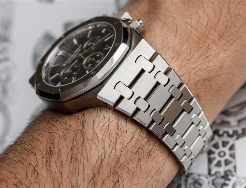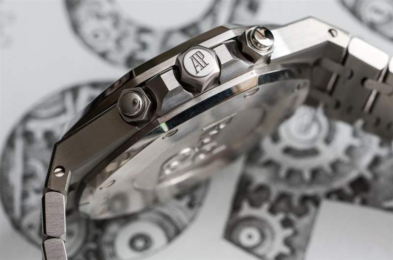 Audemars Piguet 皇家橡樹計時碼表寬 41 毫米,是一款由大量優(yōu)質(zhì)不銹鋼制成的大型時計。回想一下,皇家橡樹的“巨型”版本(通常被稱為)只有 39 毫米寬。表殼的表耳到表耳的距離較長,為53mm,并且由于表耳結(jié)構(gòu)的間距較大,佩戴尺寸在視覺上有所增加。防水性只有 50m,對于日常佩戴來說綽綽有余,但如果愛彼想進(jìn)一步推動皇家橡樹的“運動”方面,我認(rèn)為 100m 是一個更具競爭力的數(shù)字。