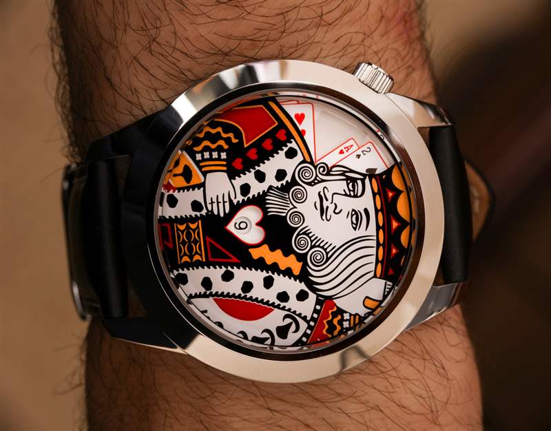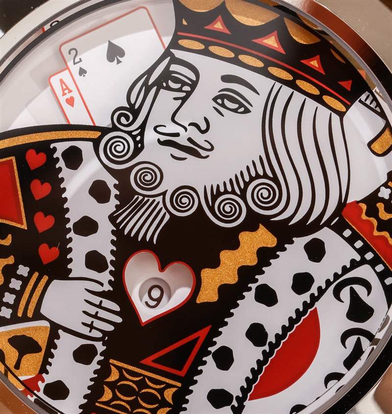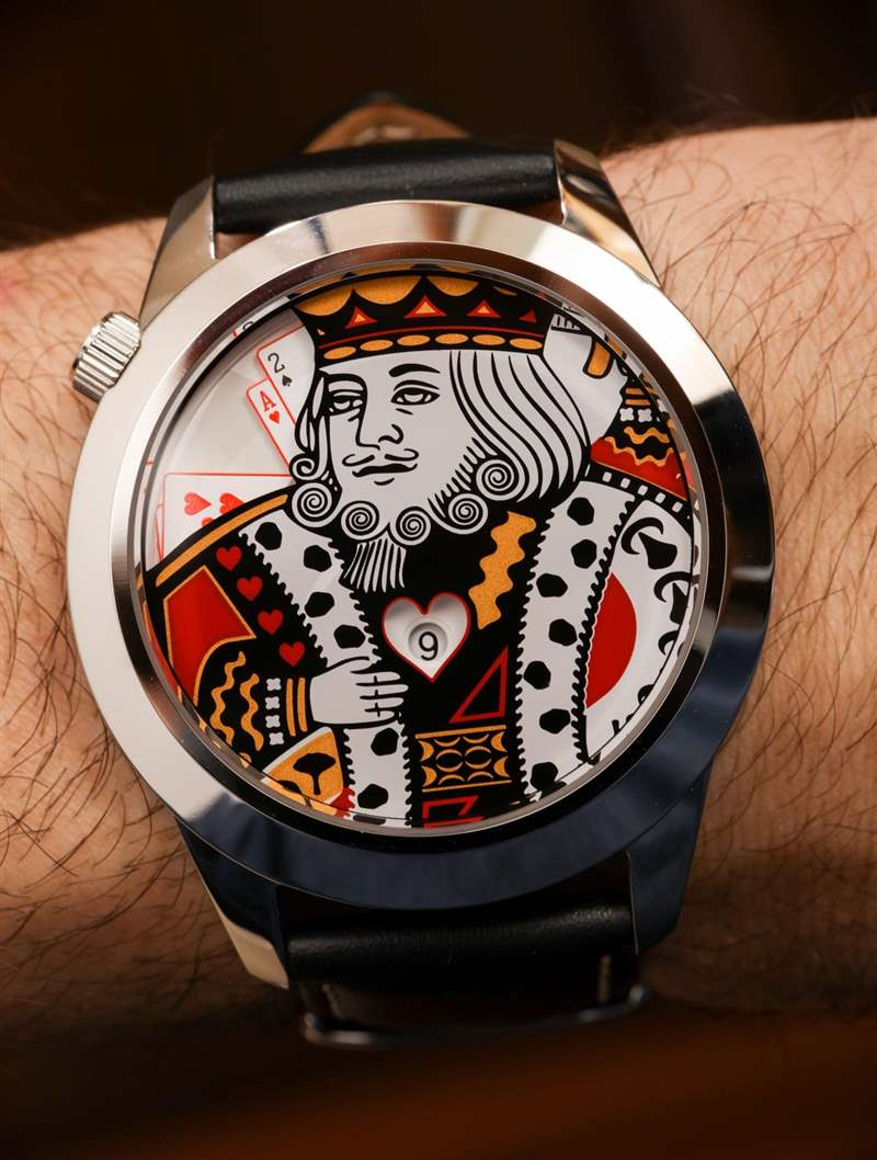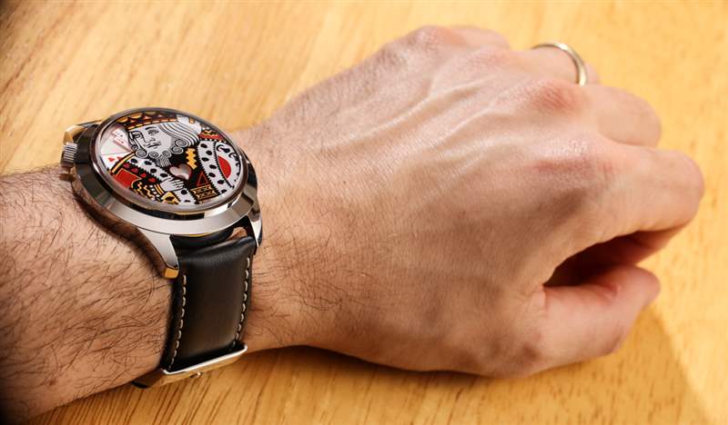 雖然 King XL 的技術元素滿足了我作為手表愛好者的需求,但這種類型的時計并不是要給其他手表書呆子留下深刻印象。這是一款時尚手表,當您認為在身上佩戴撲克牌 King 角色會增加您想要傳達的風格信息時。表盤顯然不是最清晰的,小時指示器的心形窗口都在較小的一側,考慮到表盤的深度,很難從某個角度閱讀。所以這意味著要輕松閱讀這個表盤,你需要直接看它。您也無法真正將時間精確到分鐘。分鐘指示器盤有六個指示器——一個小時內的十分鐘段中的每一個。Ace 牌用來表示“10”,而其他數字牌則用來表示十分鐘的各個部分。您可以以 2-4 分鐘的精度讀取時間。用我們的手機,考慮到這款手表是為了好玩——我可以原諒這一點,我只想知道這不是一款運動手表,也不是我想經常看手表時戴的手表為了告訴時間。我認為 King XL 在社會吸引力方面彌補了它缺乏易讀性的原因。