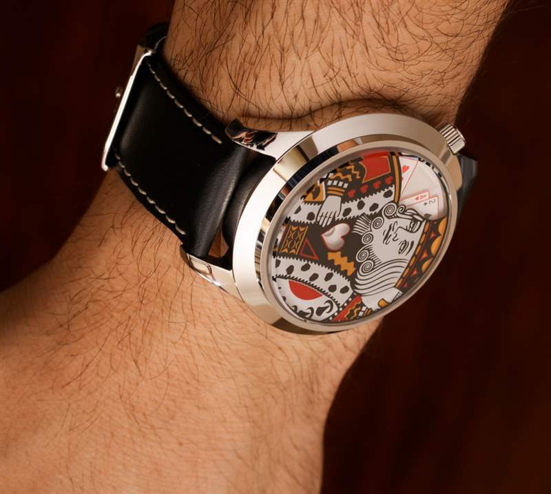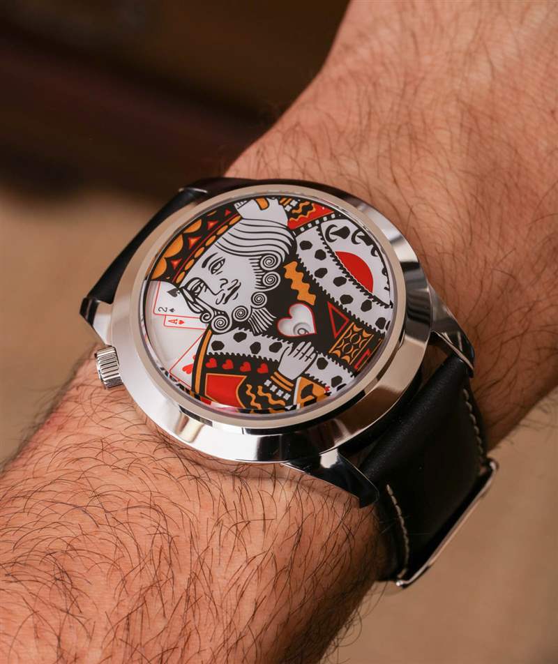 King 手表的核心(沒有雙關語)是一款跳時時計,通過圓盤切割讀取分鐘,看起來就像移動的撲克牌。King手表的美學主題顯然是無處不在的撲克牌的人物藝術。Mr. Jones Watches 正確地展示了一種如此常見的視覺效果,與游戲和追求的概念如此相關,而且在時尚界很少使用,以至于將撲克牌王戴在手腕上的結果感覺有點新奇。現在,眾所周知,奢侈手表行業生產的手表(我很遺憾地說)似乎或多或少地慶祝賭博。這與慶祝撲克牌或游戲用具的藝術相反。我個人(不是一個賭徒)對“賭場主題”手表不感興趣,廣告訊息廣告信息結束