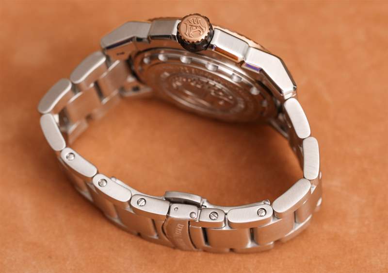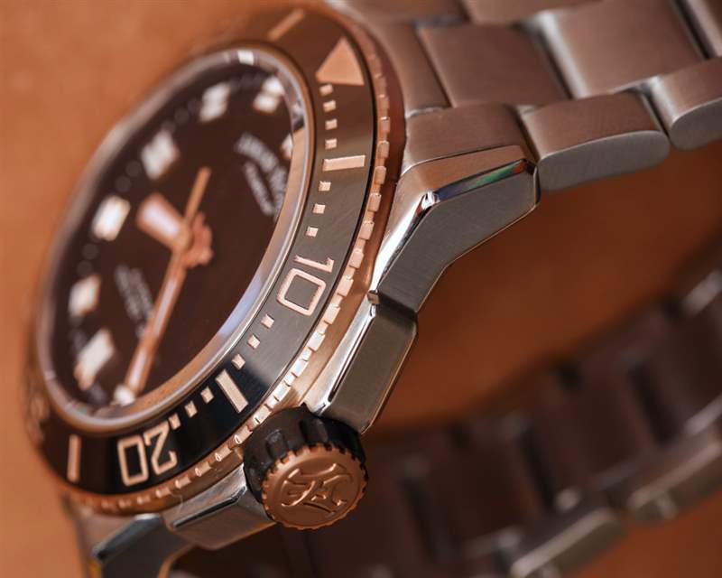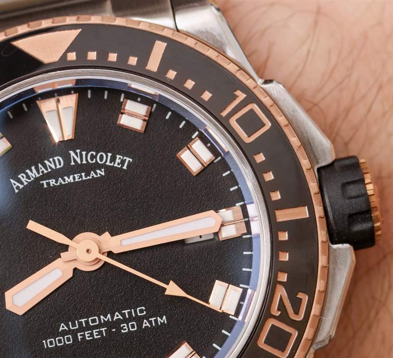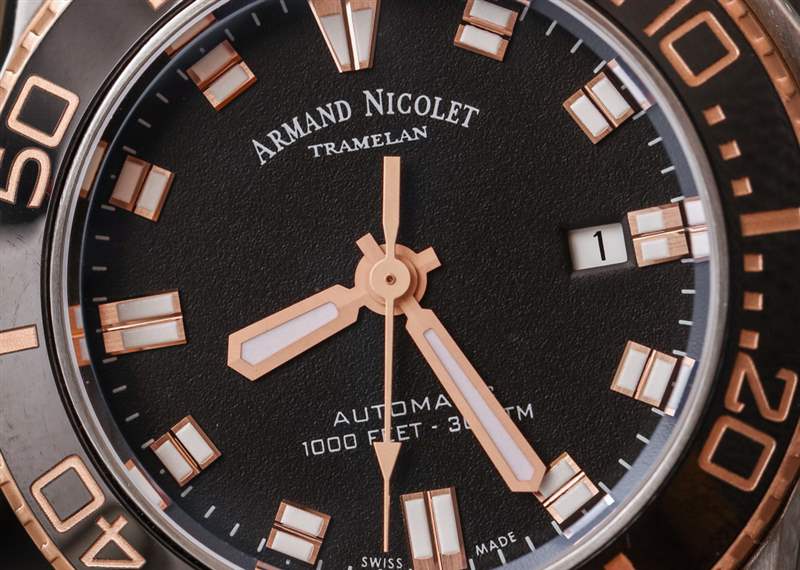 表盤周圍是我上面提到的傾斜旋轉(zhuǎn)潛水表圈。表圈嵌件材料采用拋光黑色陶瓷,表圈上的機(jī)切數(shù)字根據(jù)JS9的版本涂有不同的顏色。除了這種玫瑰金色油漆外,其他版本還使用了白色/銀色。JS9 的表盤顏色目前為白色、黑色和藍(lán)色。Armand Nicolet 似乎真的很喜歡玫瑰金外觀,因?yàn)?2018 年可用的 JS9 型號中有一半以上采用這種顏色。一些最有趣的與審查版本相似,但帶有白色表盤。“經(jīng)典” JS9 潛水表型號可能是帶有銀色/白色文字/標(biāo)記和藍(lán)色或黑色表盤的型號。