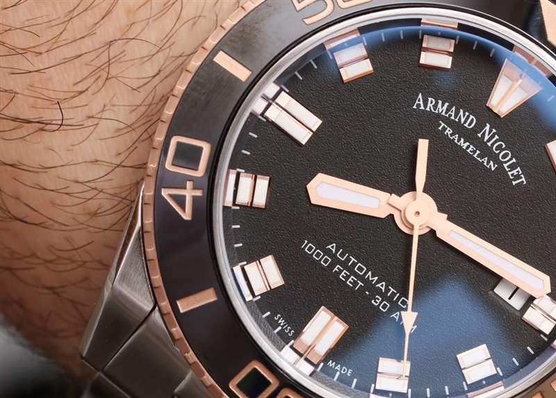 除了金屬手鏈之外,我還想要一條橡膠表帶,這實(shí)際上是一件好事。Armand Nicolet 設(shè)法制造出一款新的潛水表,它不會(huì)立即讓人感覺像其他品牌的潛水表,同時(shí)它也設(shè)法讓人感覺現(xiàn)代和陽剛。不,該設(shè)計(jì)并不適合所有人,但每當(dāng)我看到有人嘗試新事物時(shí),我都會(huì)非常高興。Armand Nicolet 的靈感當(dāng)然來自以宇舶 Big Bang 為代表的手表設(shè)計(jì)風(fēng)格(大膽、工業(yè)、男子氣概的風(fēng)格,混合了許多顏色和材料)。同時(shí)你會(huì)感覺到這款手表可以用作工具表。我最喜歡這款黑色和玫瑰金色 JS9 版本的功能之一是時(shí)針、分針和秒針的啞光處理。