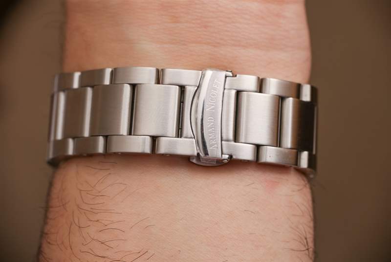 手表愛好者會(huì)注意到表耳設(shè)計(jì)令人想起愛彼皇家橡樹或宇舶 Big Bang。這種設(shè)計(jì)使表鏈和表耳的末端在視覺上融合在一起,形成了一個(gè)堅(jiān)固的結(jié)構(gòu)。現(xiàn)在,橡膠表帶不像漂亮的金屬手鏈那樣“花哨”,但它們對于實(shí)際運(yùn)動(dòng)目的更有意義。Armand Nicolet 要求您在手鏈或橡膠表帶之間進(jìn)行選擇,而無需同時(shí)提供它們。我本來希望手鐲上的 JS9 手表版本還包括一條橡膠表帶。我很確定消費(fèi)者愿意為此支付適度的溢價(jià)。