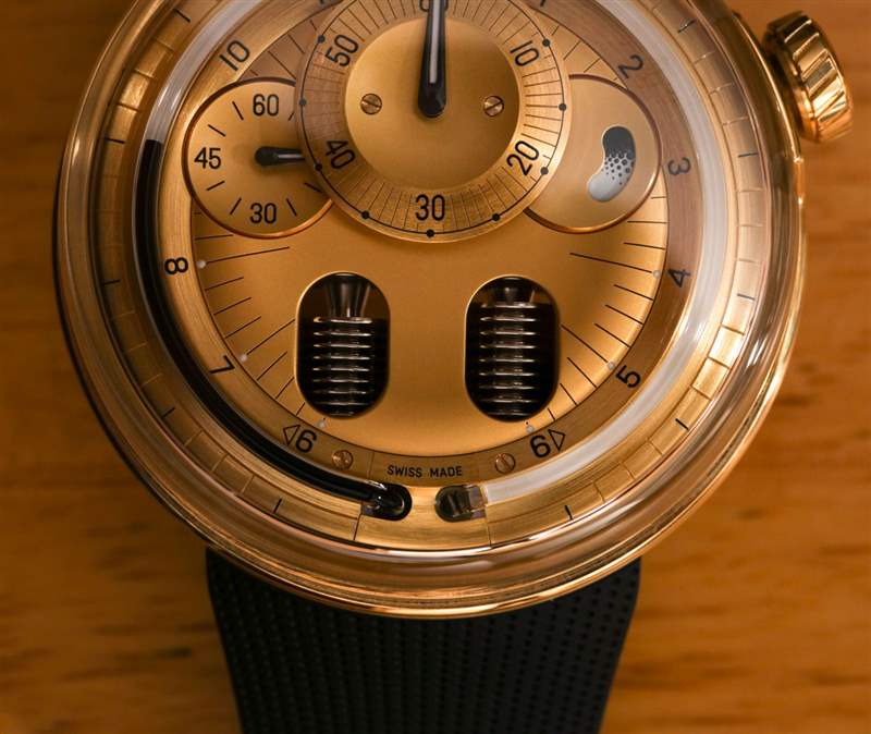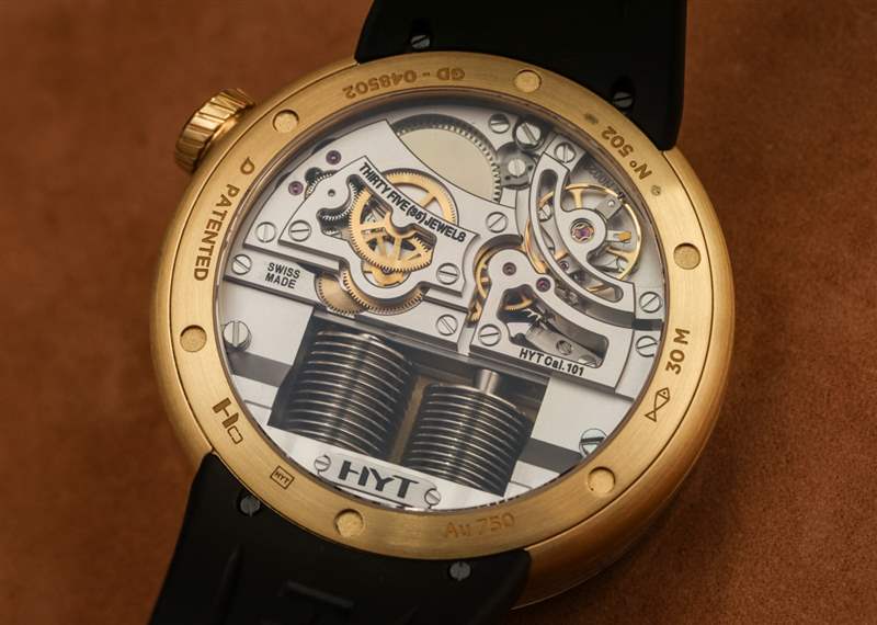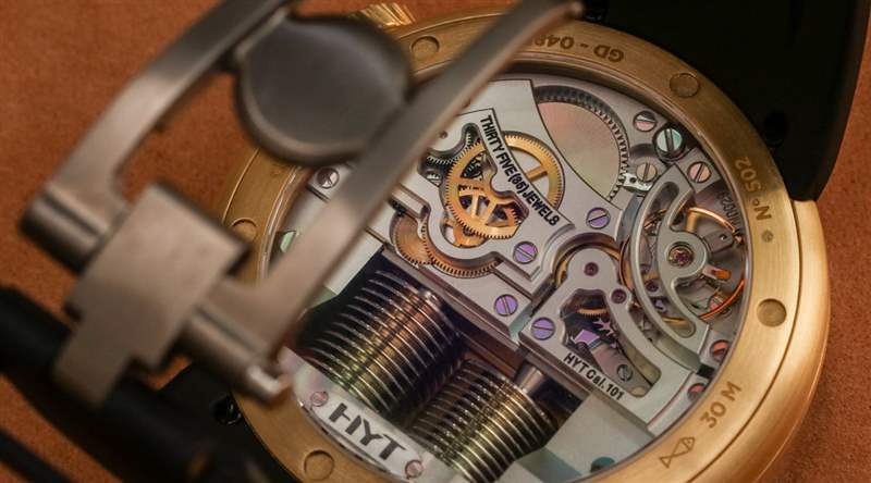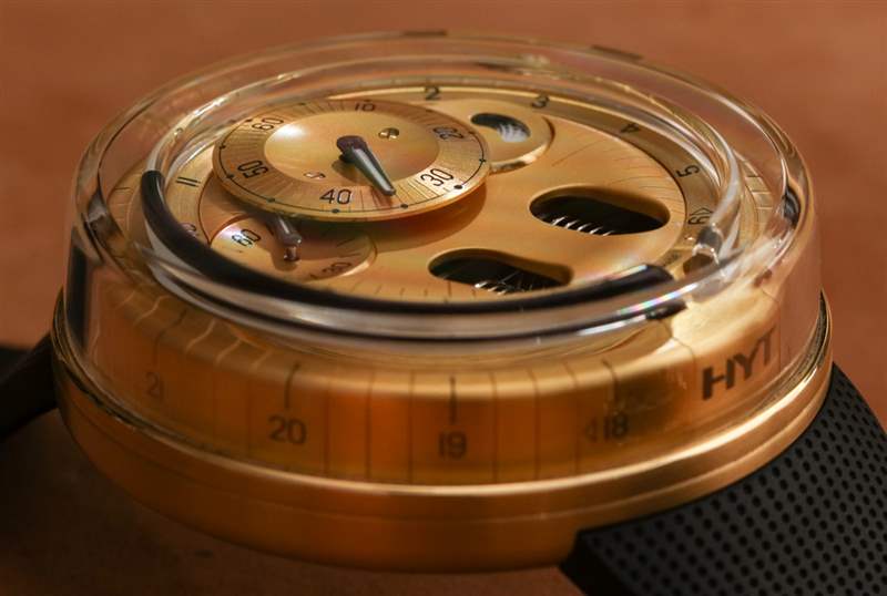 在使液體計時系統正常運行時,緩慢是您的朋友。HYT 101 機芯手表的每個人最喜歡的部分是當液體小時指示器觸及管子末端時看到表盤。這會導致波紋管復位并且相反的液體將指示點一直移動回起點。這可能是你一天只有兩次的最有趣的幾秒鐘。