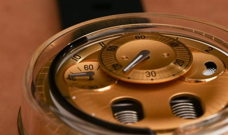 在“液壓機械”時標指示器中與淺金色配對的是黑色液體(或在另一個 2N 金型號中為紅色)。藍寶石水晶“毛細管”管后面是一個發光條,它在黑暗中發光,有助于在光線不足的情況下閱讀手表。HYT 的 101 型手動上鏈機芯為 H0 提供動力,就像它為 H1 提供動力一樣。HYT 為機芯中的螺絲帽著色,當機芯表面在光線的作用下反射出紫色陰影——這是我以前在 H0 手表中從未見過的。機芯以 4 赫茲運行,動力儲存 65 小時,分針和秒針顯示在單獨的表盤上,動力儲存指示器位于輔助秒針盤對面。廣告訊息廣告信息結束
